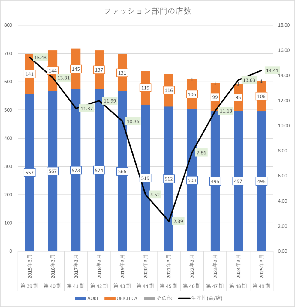 では、AOKIホールディングスの利益の半分を誇るファッション部門について詳しく見てみましょう。現在ファッション部門では郊外大型店の「AOKI」とショッピングセンターでの出店を主とした「ORICHICA」、それに大きいサイズを専門に扱う「SizeMax」の3種類の店舗があります。有価証券報告書でAOKIとORICHICAの店舗数が記載されていましたので纏めてみました。