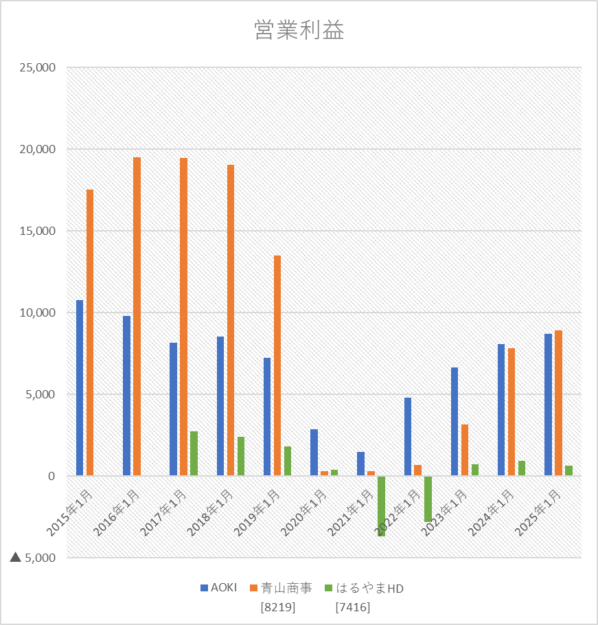 ただ、この差が最近小さくなっています。2025年の売上高を比較してみましょう。AOKIは1,026億21百万で青山は1,331億9百万と1.3倍程度まで接近しており、営業利益に至ってはAOKIが86億90百万、青山は89億27百万とほとんど差がありません。ちなみに”はるやま”はコロナ明けから営業利益が上向いていません。売上高もAOKIと青山は少しずつ上昇しているなか、はるやまは下がっています。結構苦しそうです。