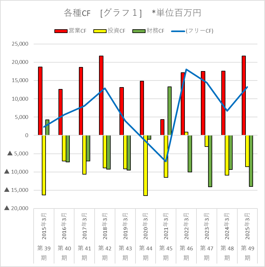 まず、各種CF状況を確認します。コロナ期も合わせて営業CFは常にプラス域です。