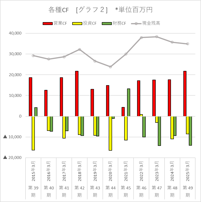 キャッシュフローは大体「+、-、-」と健全。フリーキャッシュフローも大体プラス。現金もしっかり保有しており概ね問題ないでしょう。
