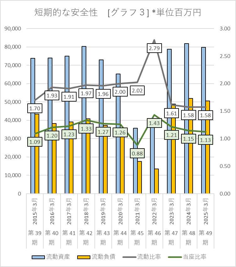 最初に短期的な安定性を確認します。流動資産と流動負債の関係を見ました。すべての年で「流動資産>流動負債」となっており、流動倍率はコロナ前は2倍無い程度でコロナ明けからは1.6倍程度で推移しています。
