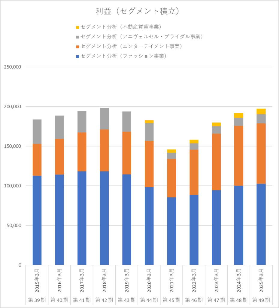 各年のセグメントごとの利益を積立グラフにしてみました。2015年では6割強がファッション部門で残りをアニヴェルセル・ブライダル事業とエンターテイメント事業が半分ずつで割っており、エンターテイメント事業は全体の2割程度という状態でした。