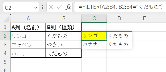 =FILTER(A2:B4, B2:B4="くだもの")