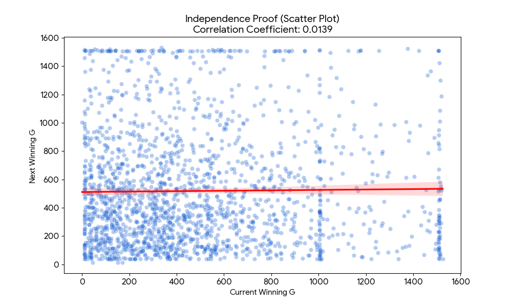 前回当選ゲーム数と次回当選ゲーム数の相関係数は「-0.0094」。これは統計的に「ほぼ無相関」を意味します。