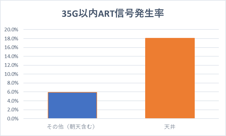 通常のAT終了後の引き戻し率はそこまで高くありませんが、今回の集計データ(n=2015)において、1501G以上の天井到達後に限っては、35G以内の当選率が18.1%という高い数値を記録しました。